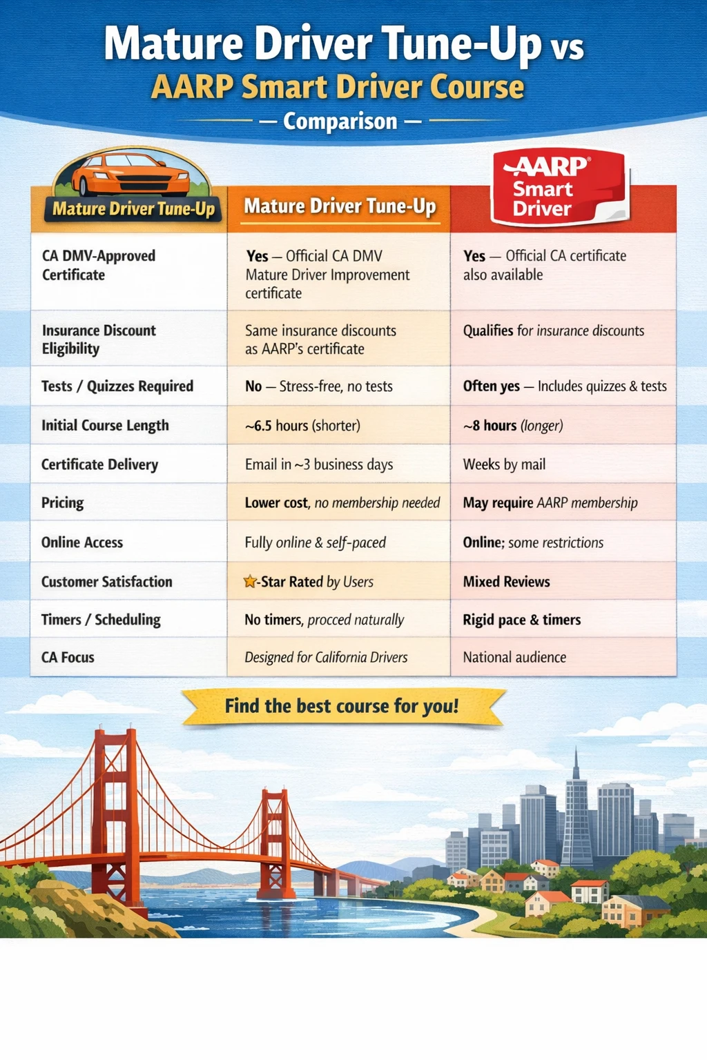Get the same renewal certificate and auto insurance discount—without the frustration with the Mature Driver Tune-Up course.
